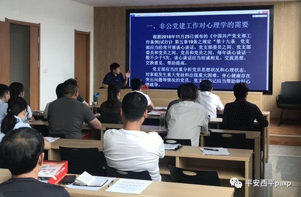 郇院長以“非公企業(yè)黨建工作中的心理學(xué)應(yīng)用”為主題,通過理論講解、剖析典型個案,深入淺出地介紹了為什么非公企業(yè)黨建工作需要心理學(xué)、當(dāng)前的研究及應(yīng)用以及如何進(jìn)行心理評估和疏導(dǎo),幫助非公企業(yè)黨員應(yīng)對壓力,科學(xué)調(diào)適心理,為其有效化解壓力、塑造陽光心態(tài)開出多劑良方。