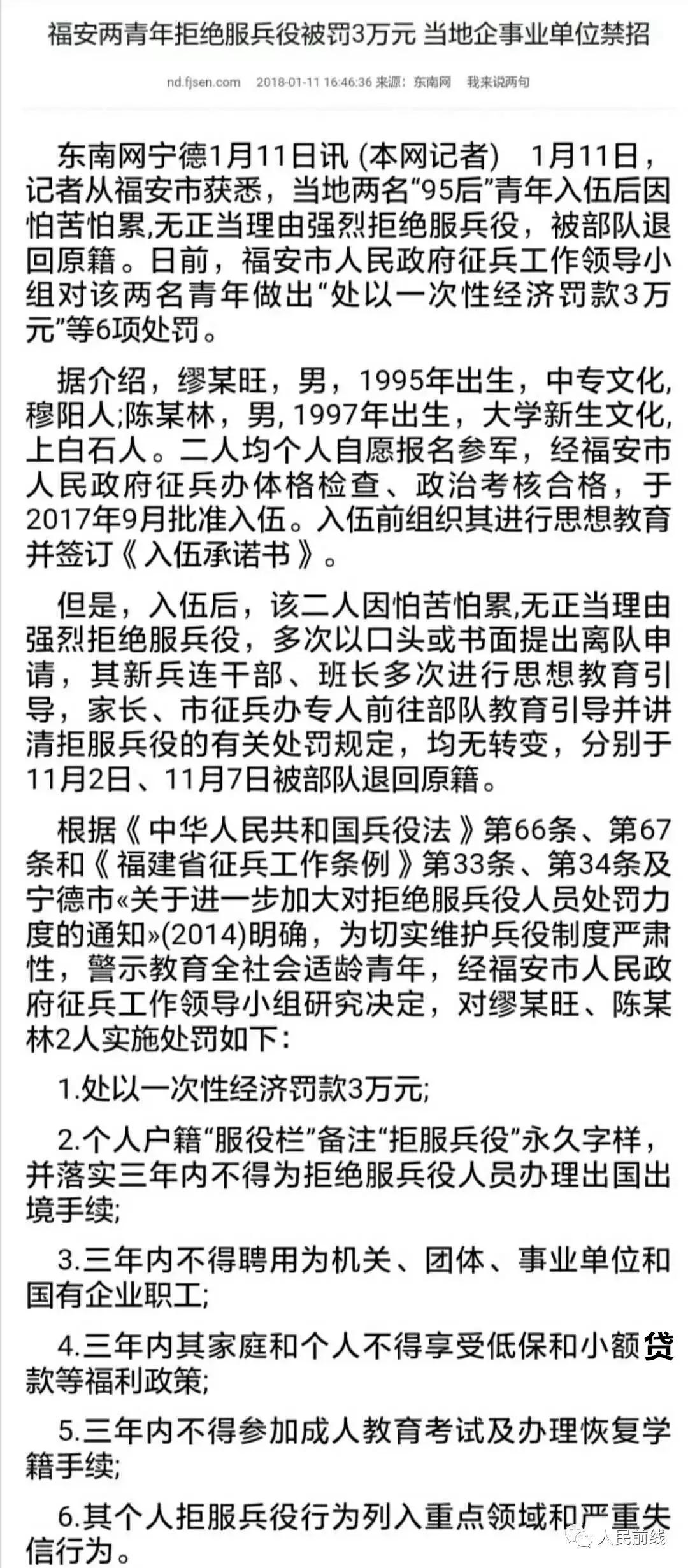 2014年7月,江蘇丹陽(yáng)青年陳某入伍后怕苦畏難拒服兵役,被罰款8萬(wàn)元,取消其家屬軍屬待遇,收繳全部?jī)?yōu)待金;不得復(fù)學(xué);兩年內(nèi)不得錄用為公務(wù)員、國(guó)企職工及不得出國(guó)。