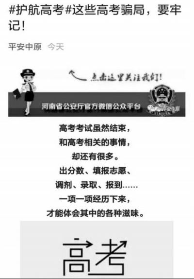 針對高考結束后常見的招生騙局,“平安中原”發(fā)布了《#護航高考#這些高考騙局,要牢記!》,“洛陽交警微發(fā)布”發(fā)布了《又來了!這些高考騙局請你警惕!考生還有啥要注意?必看!》,列舉了騙子常見的手段,如謊稱低分能“跳檔”錄取、花錢能買“內部指標”等,提醒廣大考生、家長提高警惕。