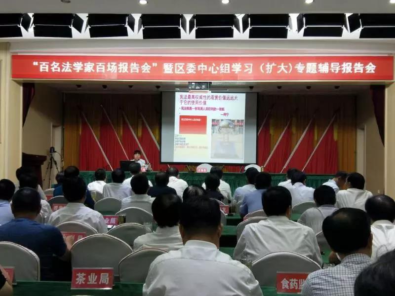 8月14日,信陽市浉河區(qū)舉辦“百名法學(xué)家百場報告會”暨區(qū)委中心組學(xué)習(xí)(擴大)專題輔導(dǎo)報告會,報告會由信陽市浉河區(qū)區(qū)長于海忠主持,區(qū)委副書記梁玉峰、區(qū)委政法委書記宋昊、區(qū)委宣傳部部長杜娟等區(qū)委中心組成員(在職副處級以上領(lǐng)導(dǎo))與會聽取輔導(dǎo)報告,區(qū)委辦分管副主任,區(qū)人大、區(qū)政府辦公室主任,區(qū)政協(xié)秘書長,區(qū)委各部委辦主要負(fù)責(zé)同志,鄉(xiāng)鎮(zhèn)辦事處黨政正職1人,區(qū)直單位主要負(fù)責(zé)人,區(qū)法學(xué)會成員單位代表等近160人到會。