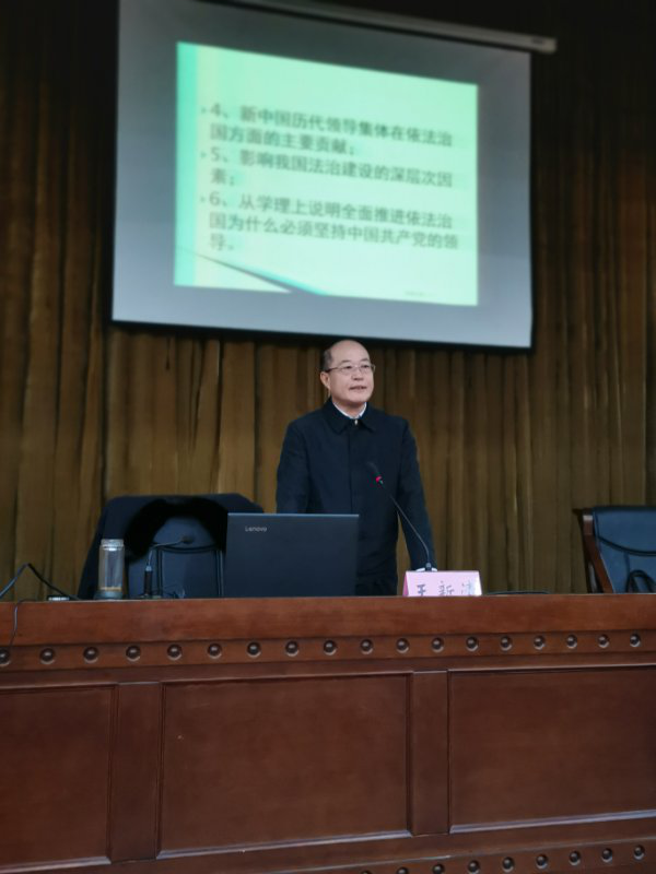 25日下午,王新清教授圍繞“全面推進(jìn)依法治國的思想和實(shí)踐”課題,從①習(xí)近平依法治國新理念新思想新戰(zhàn)略的核心內(nèi)容;②習(xí)近平依法治國新理念新思想新戰(zhàn)略的學(xué)理基礎(chǔ);③法治和道德建設(shè)具有共同的邏輯起點(diǎn);④新中國歷代領(lǐng)導(dǎo)集體在依法治國方面的主要貢獻(xiàn);⑤影響我國法治建設(shè)的深層次因素;⑥從學(xué)理上說明全面推進(jìn)依法治國為什么必須堅(jiān)持中國共產(chǎn)黨的領(lǐng)導(dǎo)6個(gè)方面。談古論今、由內(nèi)及外,給我縣黨委理論學(xué)習(xí)中心組和全縣領(lǐng)導(dǎo)干部作了一次精彩的法治專題報(bào)告,對我縣領(lǐng)導(dǎo)干部提高政治站位、深化思想認(rèn)識、增強(qiáng)法治思維具有很強(qiáng)的指導(dǎo)意義。
