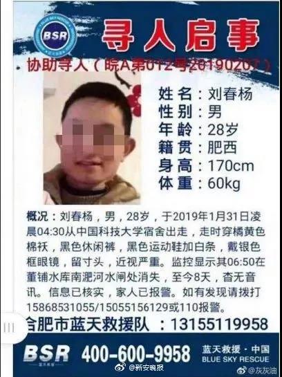 1月31日凌晨4點半,劉春楊從學校宿舍離開后失蹤。監(jiān)控顯示,劉春楊走兩個多小時后,在合肥董鋪水庫南淝河水閘處消失。