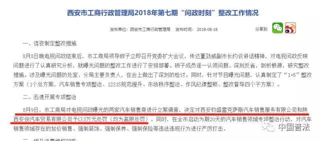 記者注意到,2018年8月,陜西一檔電視問政節(jié)目曾曝光4S店存在強(qiáng)制加價(jià)銷售汽車等問題。隨后,西安市工商局對電視問政曝光的兩家汽車銷售商進(jìn)行立案調(diào)查,決定對西安鈞盛雷克薩斯汽車銷售服務(wù)有限公司和陜西安俊汽車貿(mào)易有限公司予以3萬元處罰(均為高限處罰)。同時(shí),在全市啟動為期20天的汽車銷售領(lǐng)域?qū)m?xiàng)整治行動,對汽車銷售領(lǐng)域存在的加價(jià)銷售、強(qiáng)制裝飾、強(qiáng)制保養(yǎng)、強(qiáng)制保險(xiǎn)等違法違規(guī)行為進(jìn)行嚴(yán)厲打擊。