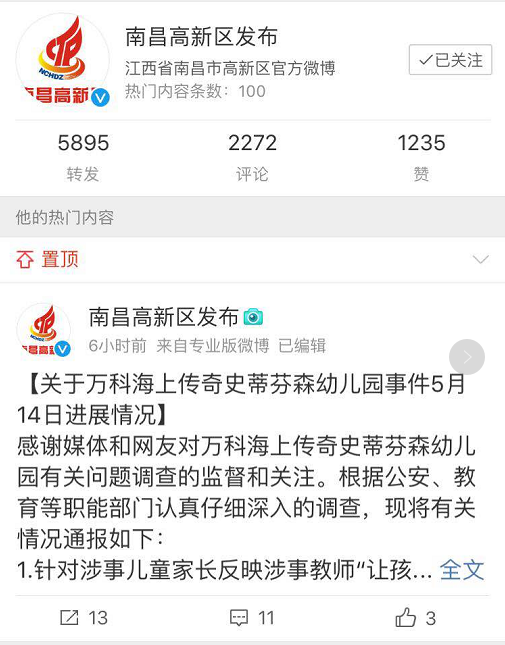 15日,江西省南昌高新區(qū)發(fā)布(官方微博)通報(bào)萬科海上傳奇史蒂芬森幼兒園事件5月14日進(jìn)展情況——