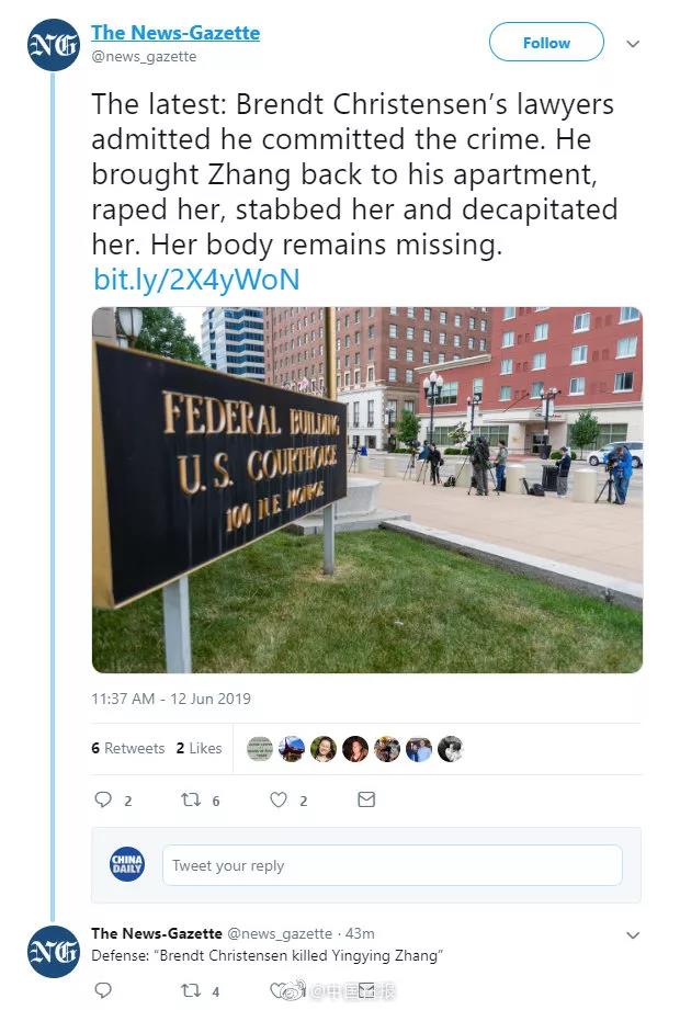 據(jù)伊利諾伊州媒體《新聞公報》報道,美國聯(lián)邦助理檢察官尤金·米勒(Eugene Miller)代表檢方在開案陳詞中詳述了章瑩穎的遭遇:“他綁架了她,他謀殺了她,他掩蓋了他的罪行”。