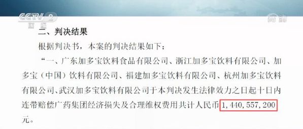 據(jù)白云山2018年7月27日公告顯示,控股股東廣藥集團(tuán)與加多寶之間侵權(quán)糾紛一審判決,廣東高院判處加多寶相關(guān)6家主體公司自判決發(fā)生法律效應(yīng)起十日內(nèi),賠償廣藥集團(tuán)相關(guān)經(jīng)濟(jì)損失及合理維權(quán)費(fèi)用共計(jì)14.41億元。