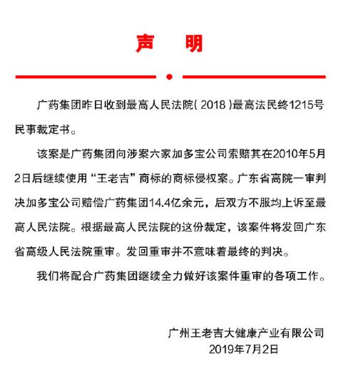 7月2日中午,廣藥集團(tuán)通過(guò)王老吉官方微博發(fā)布聲明稱(chēng),廣東省高院一審判決加多寶公司賠償廣藥集團(tuán)14.4億,后雙方不服均上訴至最高人民法院,該案件返回廣東省高級(jí)人民法院重審。