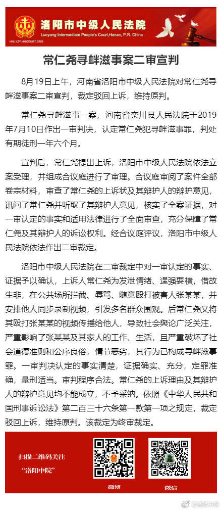 8月19日上午,河南省洛陽(yáng)市中級(jí)人民法院對(duì)常仁堯?qū)め呑淌掳付徯?,裁定駁回上訴,維持原判。