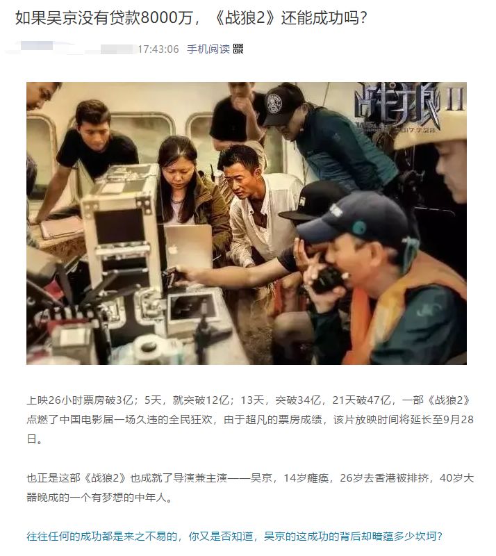 5月5日,因以《戰(zhàn)狼2》為背景編撰營(yíng)銷文章,使用吳京照片,就有兩家公司被吳京告上法院。