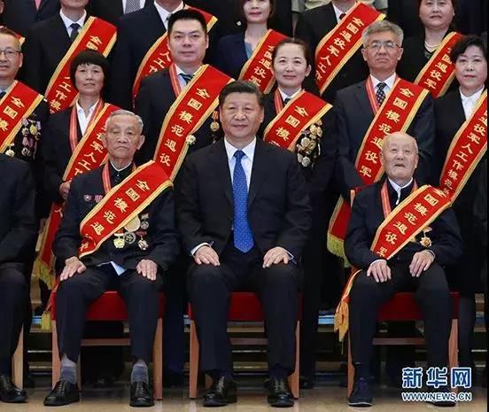 2019年7月26日,黨和國家領(lǐng)導(dǎo)人習(xí)近平、李克強、王滬寧等在北京會見全國退役軍人工作會議全體代表。在習(xí)近平總書記身旁的分別是張富清(右)和朱再保(左)。