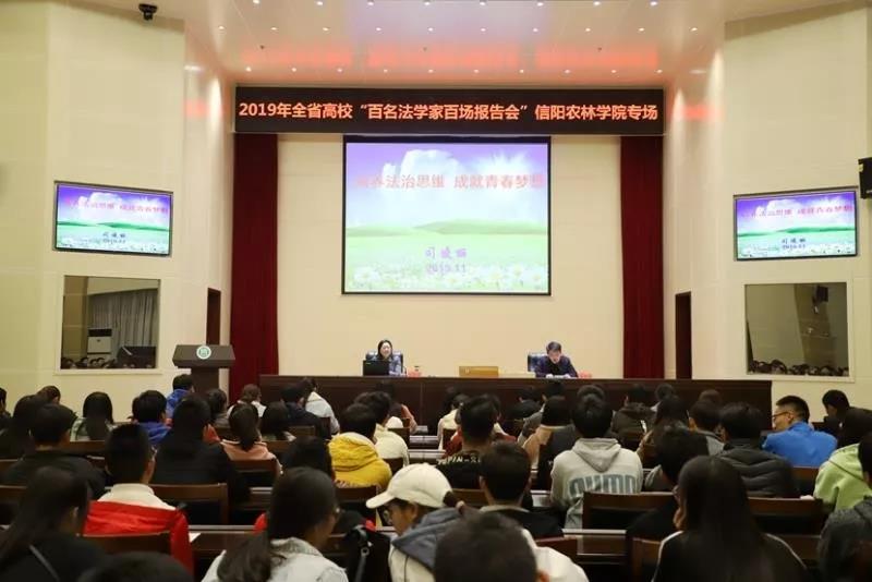 為進一步深入宣傳貫徹習近平總書記全面依法治國新理念新思想新戰(zhàn)略,切實增強廣大師生堅持中國特色社會主義法治道路、理論體系、制度的自覺性、堅定性,11月21日,“百名法學家百場報告會”信陽農(nóng)林學院專場開講。信陽市法學會副會長司凌麗作題為《培養(yǎng)法治思維,成就青春夢想》主題宣講。宣講會由信陽農(nóng)林學院黨委宣傳部副部長朱同留主持,200余名學生代表參加此次活動。
