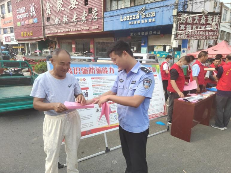 8月23日,息縣青年普法志愿者身穿紅馬甲,在鄉(xiāng)鎮(zhèn)集市上開(kāi)展全民反電信詐騙宣傳活動(dòng)。