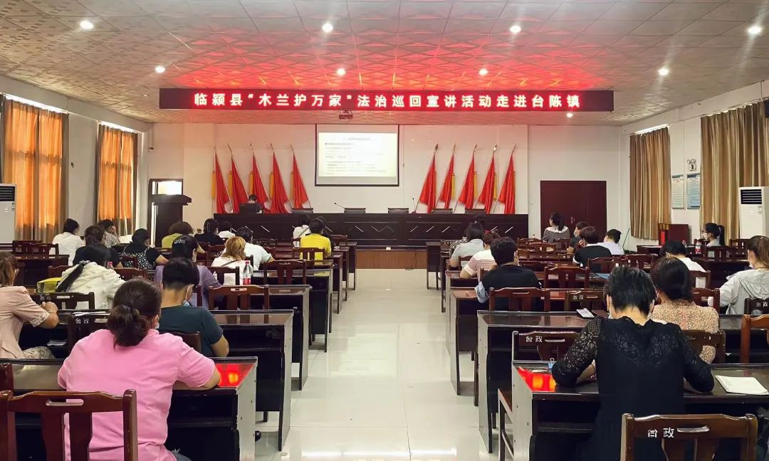 近日,臨潁縣組織青年普法志愿者到臺(tái)陳鎮(zhèn)開(kāi)展“木蘭護(hù)萬(wàn)家”法治巡回宣講活動(dòng),為該鎮(zhèn)40余名婦女群眾帶來(lái)了一堂生動(dòng)的法治課。